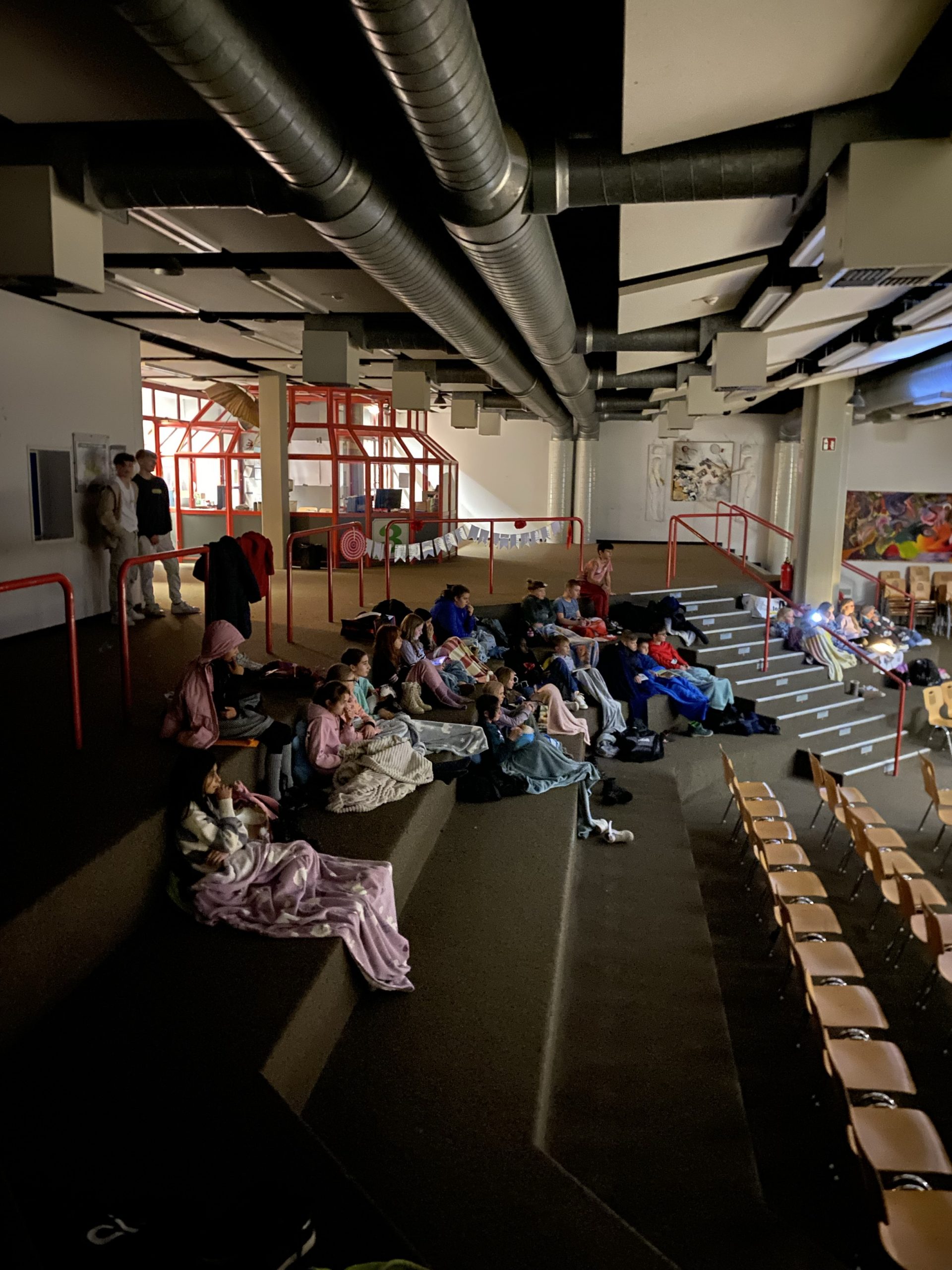 Eine Gruppe von fast 40 lesebegeisterten Kindern aus der 5. Klasse traf sich am Freitagabend um 17.30 Uhr in der Schule, um einen spannenden Leseabend zu erleben. Sie hatten alles dabei, was sie für gemütliche Lesestunden brauchten: Decken, Kissen, Kuscheltiere, Taschenlampen und natürlich gute Bücher. Die Fünftklässler*innen konnten zwischen verschiedenen Leseoptionen wählen: Sie konnten in ihren eigenen Büchern lesen, einem Hörspiel zuhören, Bücher tauschen oder sich von Zehntklässler*innen spannende und tolle Geschichten vorlesen lassen. Mit einer Tasse Kinderpunsch und einer Laugenbrezel genossen die Kinder zwischendurch auch eine kurze Lesepause.