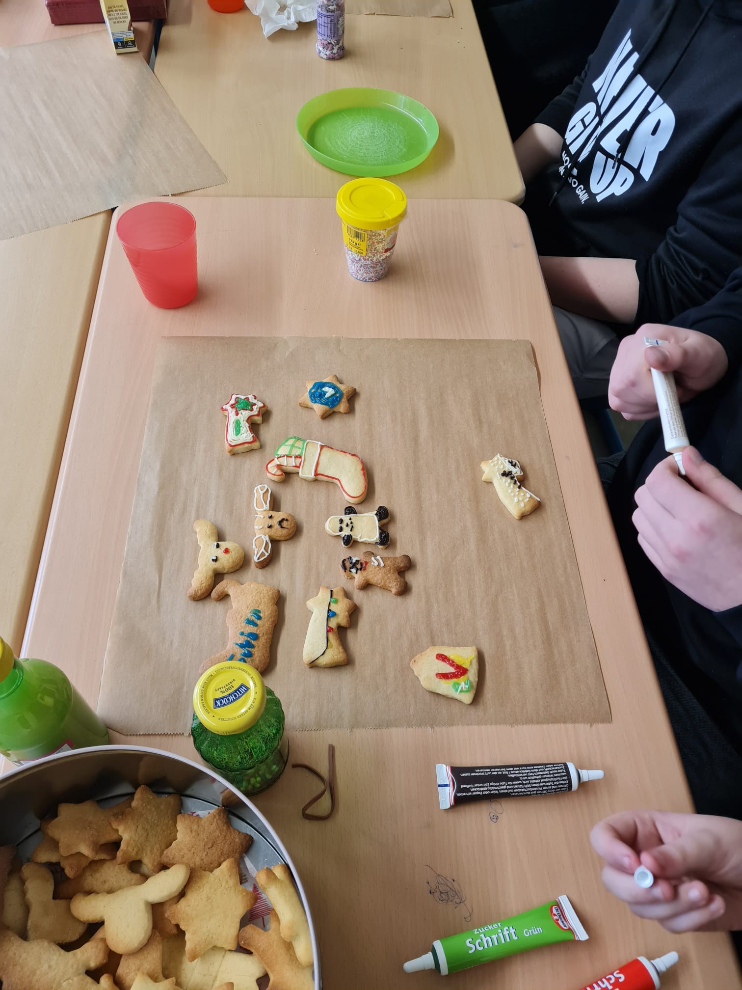 Heute hat die Klasse 7d ganz viel organisiert, um gemeinsam im Klassenverband Waffeln zu backen, Keks-Rohlinge mit Glasur und bunter Deko zu verzieren und tolle Öl-Fensterbilder zu basteln. Es war ein toller Tag, an dem alle Schülerinnen und Schüler ihre kreativen Arbeiten mit Stolz präsentiert haben.